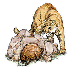 Lory State Park is located where the grasslands of the great plains meet the Front Range of the Rocky Mountains. The exhibits focus on this biodiversity with a wide range of interactive components, including many items to touch, hear and find. The focal point of the exhibit room is a diorama which shows a mountain lion descending a sandstone outcropping as it stalks a porcupine. In this diorama are mounts, nests, scat or tracks of a dozen other animals. Interpretive panels surrounding the diorama encourage visitors to look closely for subtle evidence of animal life. The diorama mural shows each of the four ecosystems of the park. Three outdoor panels on the viewing deck interpret the surrounding geology, ecosystems and wildlife watching opportunities.